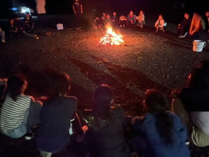 キャンプファイヤー担当の子どもたちが、消えていく炎を見ながら振り返りをしました。お天気によっては実施も検討しなければならなかったキャンプファイヤー。実施できてほんとうによかったです。