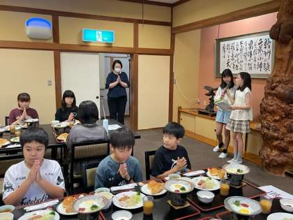宿舎での最後の食事。子どもたちの「いただきます」の言葉にはいつも宿舎の方への感謝の言葉が添えられています。最後の食事でも感謝の気持ちを「いただきます」に込めて伝えました。