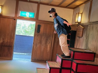 斜めの家で楽しむ子どもたち。まっすぐ立っているつもりでも‥‥‥