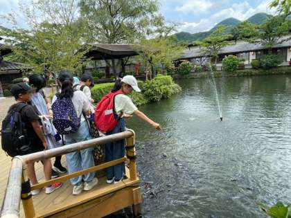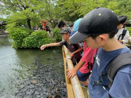江戸風情漂う池にいるコイ。お小遣いの一部を出し合ってエサをあげるグループもありました。