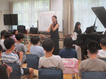 「おたまじゃくし」の方々によるバイオリン演奏を聴き、子どもたちも感動していました。実際にバイオリンに触れ、音を出す体験をしました。子どもたちのリコーダーと一緒に「威風堂々」を演奏しよい体験ができました。