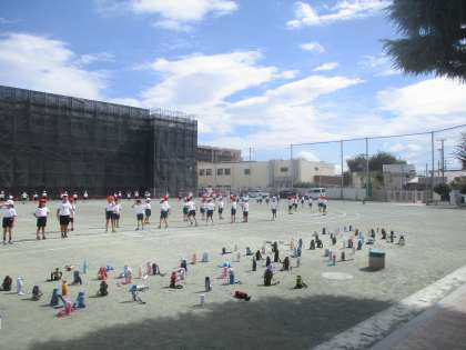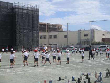 1年生は、運動会の表現練習で隊形練習を行っていました。まだまだ、暑い日が続きますので、水筒、タオルの用意をお願いいたします。