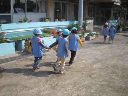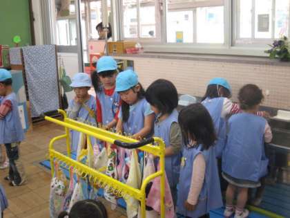 今日、年少さんは、初めての登園でした。年長さんが迎えて、教室まで送ってくれます。靴箱の入れ方など教えます。お兄さん、お姉さんとして立派にやっていました。年少さんは、お母さんと別れるのがいやで、泣く子もいましたが、教室に入ってしまえば大丈夫。こうやって自立していきます。