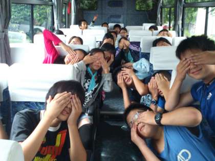 バスは東武ワールドスクエアに向かっています。三猿の「見ざる」をまねて、ハイ、チーズ!