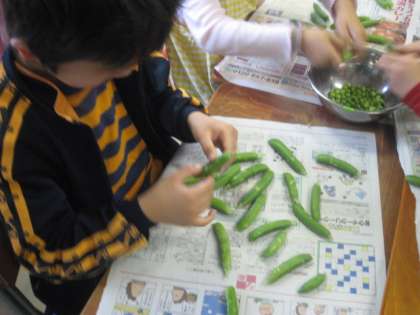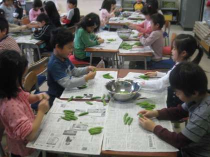 食育の一環として、2年生が、グリンピースの皮むきを行いました。2年生がむいたグリンピースが、今日の給食の「グリンピースご飯」となります。グリンピースという豆のでき方を知ったり、自分達がむいた食材を食べたりすることで、食材に関する関心を高め、残さず食べられるようにするためです。