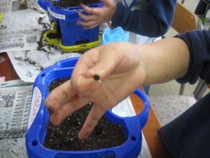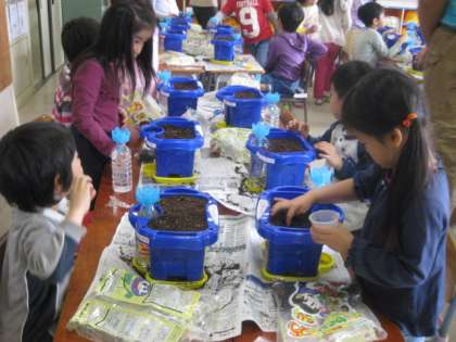 1年生は、アサガオの種まきをしていました。「早く大きくなあれ」という気持ちで大切に育てていきます。1年生も大分、学校に慣れてきました。