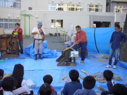 郷土研究会の皆様が準備してくださった昔使われていた道具を使い、5年生の子どもたち一人一人が脱穀の作業を体験しました。