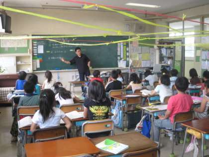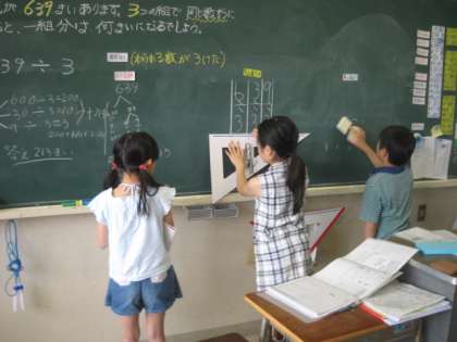 4年生の算数は、少人数授業で行っています。2クラスを3クラスの分けるので、1クラス24人程度の人数になります。少人数だと、個別指導ができやすく、一人一人に確実に力をつけることができます。門田教諭の授業を見ました。今日の課題を、いろんなやり方で解く方法を考え、それをノートに書き、発表しあっていました。ノートの書き方がうまく、発表の仕方もよかったです。力が確実につく授業でした。