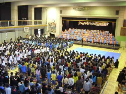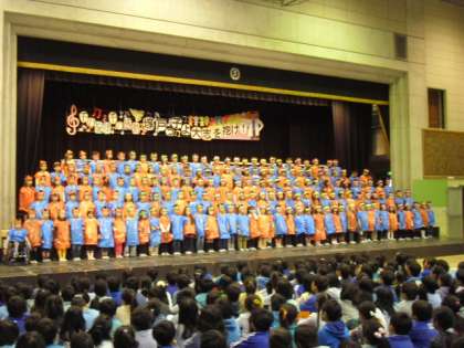 写真は全校合唱、1年生「ぐりとぐらのいちねんかん」の様子です。