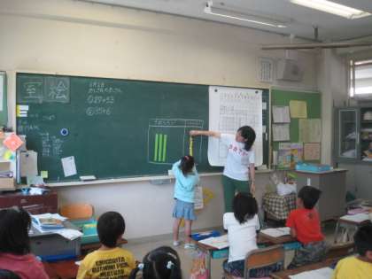 2年1組は、水田教諭です。算数の授業を見ました。「27+53、35+6、7+23の計算の仕方を考えよう」という課題です。問題の出し方に、難易度あげていきながら説かせていきます。子どもたちは、既習のやり方を使いながらノートにしっかり書いています。ノートの書き方など、うまくなりました。2年生のなってからの成長を感じます。