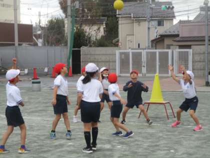 2年生の体育では、肌寒い中、元気に「的あてゲーム」をして楽しく学習する姿が見られました。