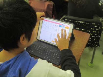 1年生は、タブレットを使った漢字学習を行っていました。6年生は、国語「鳥獣戯画」の学習をタブレットを使って取り組んでいました。