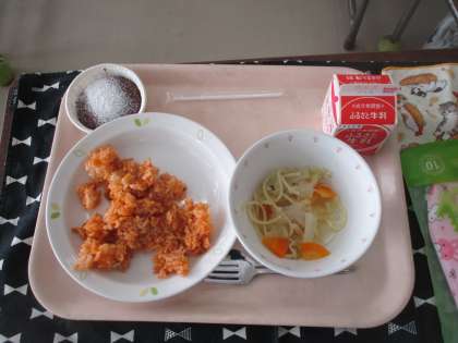 今日の献立は、チキンライス、ヌードルスープ、こめこのガトーショコラ、牛乳です。