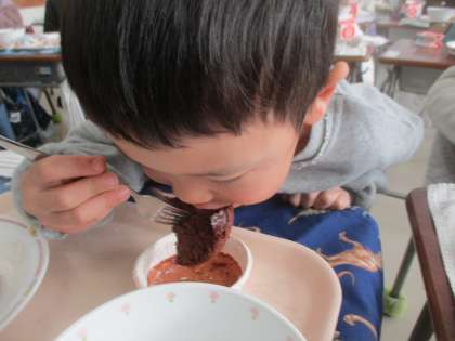 みんな大喜びで、たくさん食べている子が何人もいました。クラスによっては、じゃんけん大会が開かれていて、完食のクラスがたくさんありました。とくにガトーショコラは大人気でした。