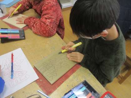 自分の氏名をもとにデザインを考え版画に挑戦していました。