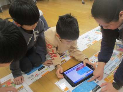 4年生を対象に、スーパーマーケットでの買い物の仕方や航空券を購入するための会話を体験しました。また、英語を使ってプログラミングを行いました。