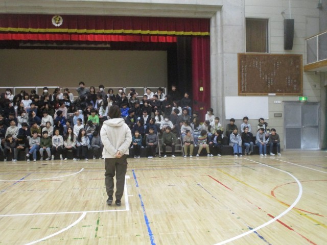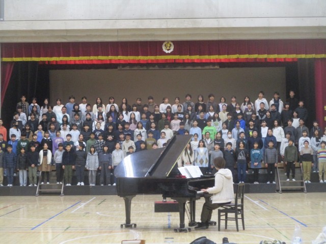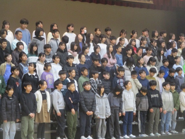 体育館では、6年生が卒業式の歌の練習を行っていました。本番と同じようにステージに立ち、音楽の先生から