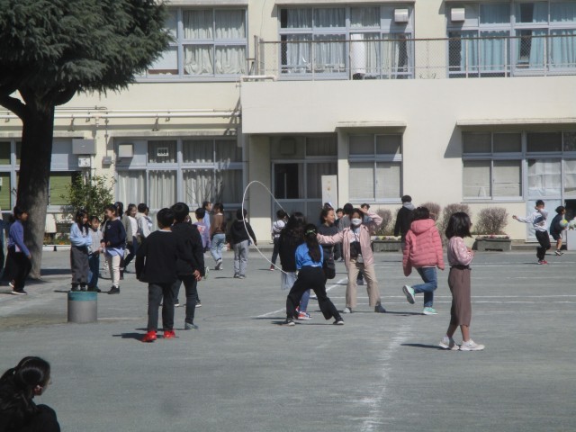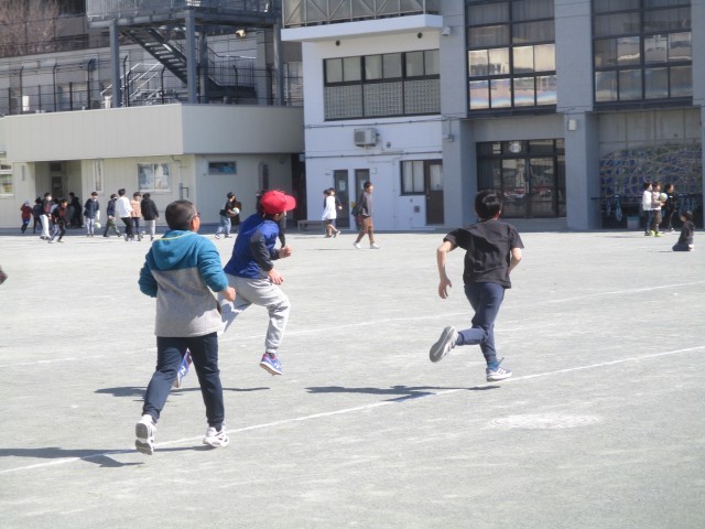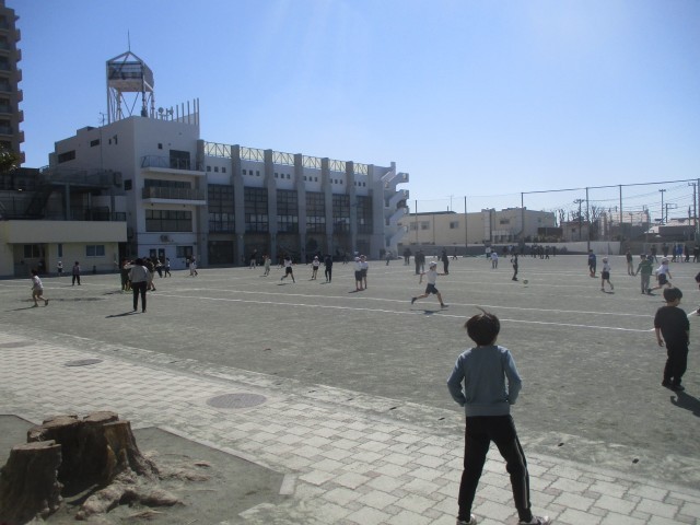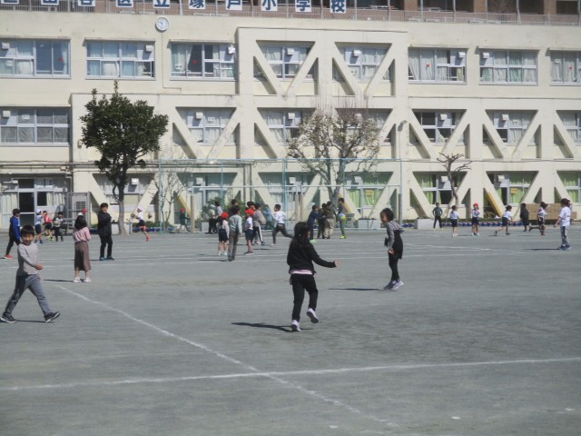 今日は、暖かなよい天気で、休み時間に多くの子が元気に遊んでいました。おにごっこやボール遊びが活発に行われ、