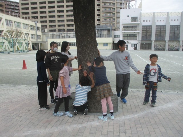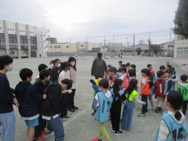 もうすぐ卒業の6年生とお世話になった1年生が校庭でいろいろな遊びをして交流を深めました。
