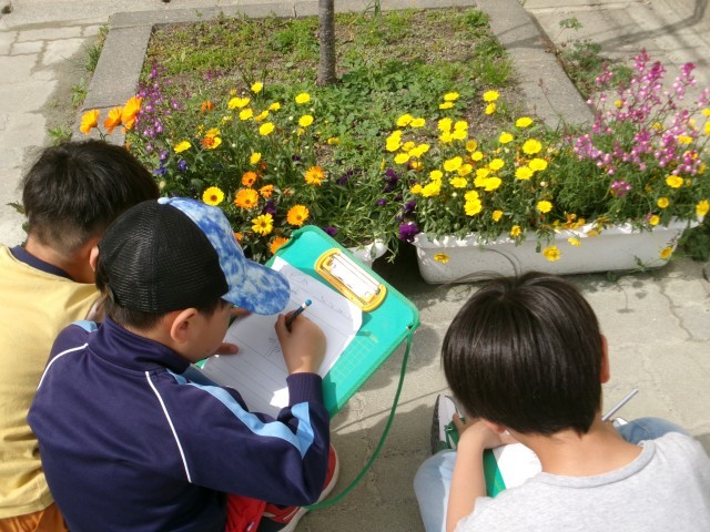 今日は、よい天気の中、3年生が理科の授業で校庭の「春の生き物・植物」探しを行っていました。