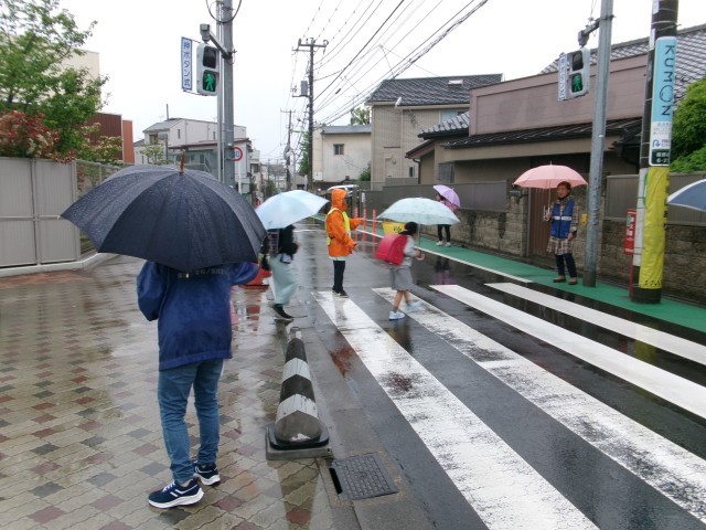 下校時は、雨の中、TAPのみなんさんが見守ってくださっていました。全校が同じ時刻の下校だったため、正門前は傘をさす児童であふれていました。TAPのみなさんがいつものように見守ってくださり、安全な下校ができました。TAPのみなさん、ありがとうございました。