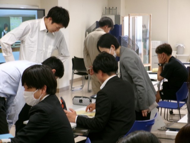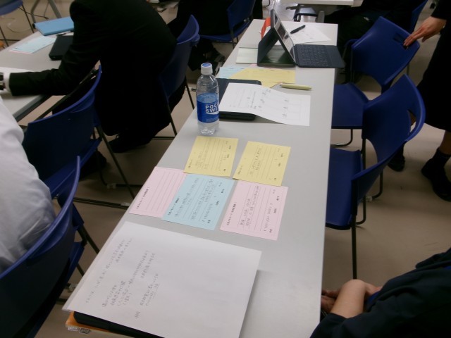 「引用カード」を用いた実践を体験しました。教員も生徒になりきって、一所懸命に調べ意見交流を行いました。