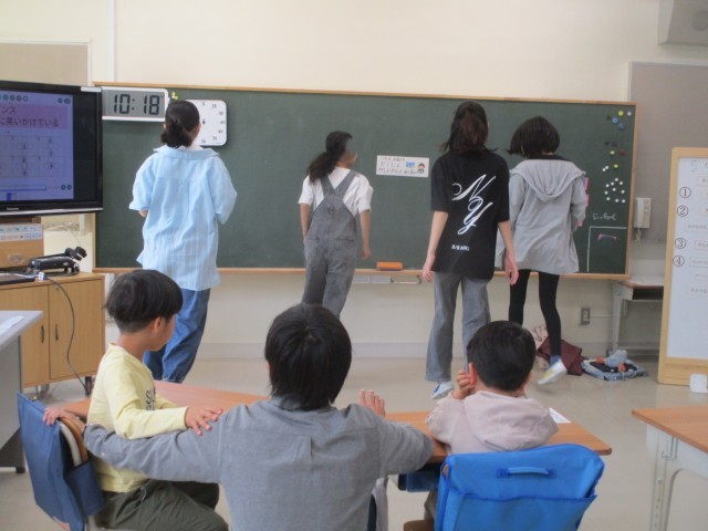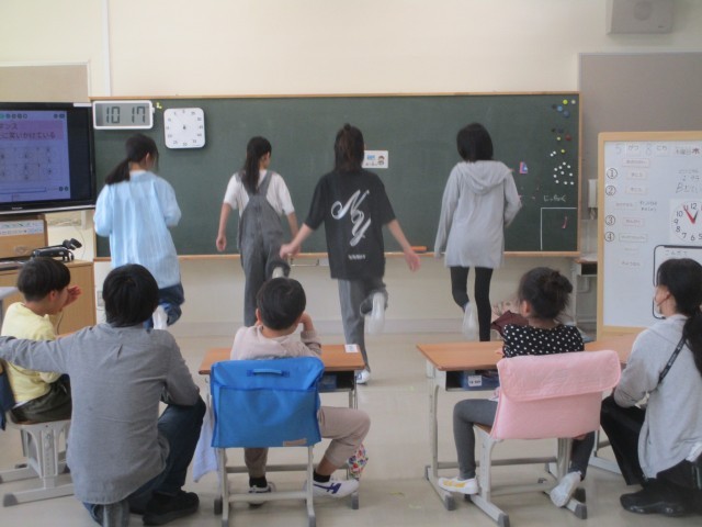 足でグー、チョキ、パーなどと分かりやすく説明し、一緒に踊りました。1年生も、だんだんとできるようになりました。