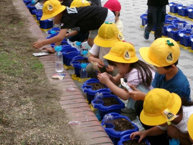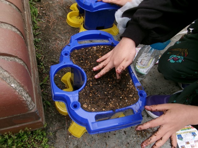 鉢に土を入れ、5,6個の種を植えるために指で穴をほり、丁寧に植えました。