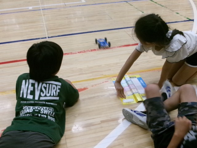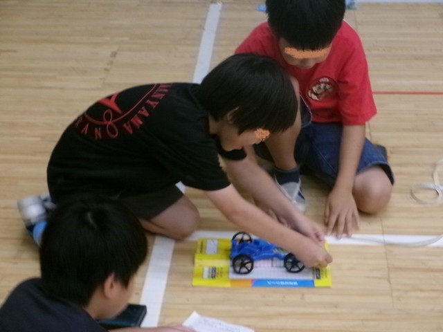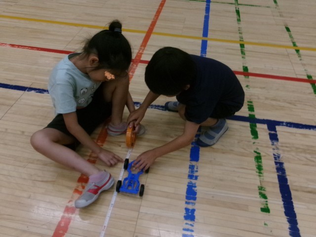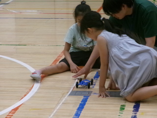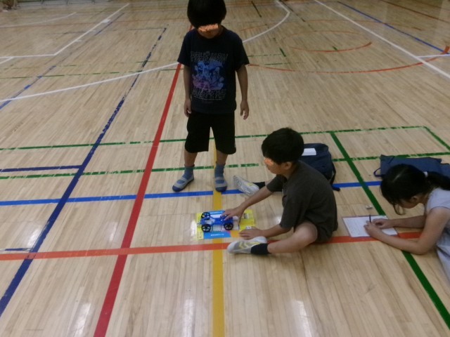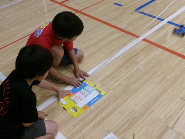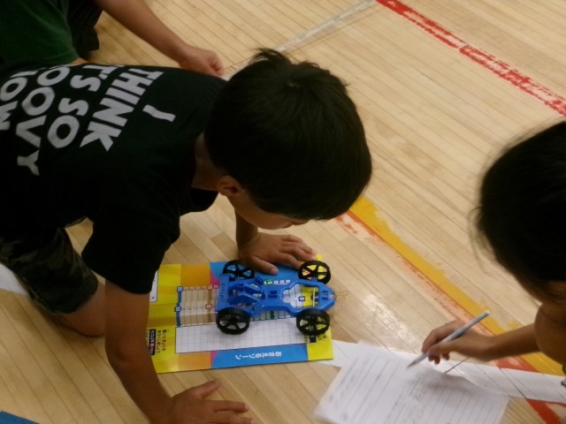 10cm、15cmとゴムを伸ばして、車がどこまで進むのか調べました。