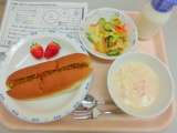 今日は、焼きカレードック、牛乳、キャベツサラダ、白菜のクリームスープ、いちごです...
