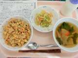 今日は、ベーコンときのこのピラフ、牛乳、サテアヤム、ブロッコリーのサラダ、トマト...