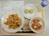 今日は、キムチチャーハン、牛乳、チンジュワンズ、春雨スープです。