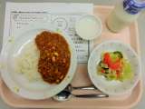 今日は、チリコンカーンライス、牛乳、イタリアンドレッシングサラダ、ホワイトゼリー...