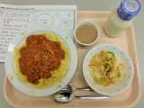 今日は、スパゲティーミートソース、牛乳、ごぼうチップサラダ、カフェラテゼリーです...