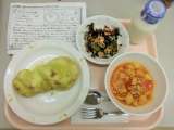 今日は、うぐいす揚げパン、牛乳、ひじきとツナのサラダ、ミネストローネスープです。
