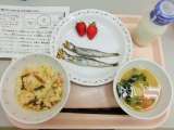 今日は 山菜おこわ、牛乳、焼きししゃも、小松菜とじゃがいものみそ汁、いちごです。