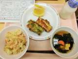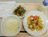 今日は、ごはん、牛乳、春野菜のうま煮、乾物和えです。