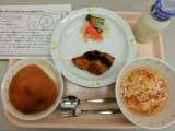 今日は、スライス入り丸パン、牛乳、白身魚のフライ、ピクルス、トマトと卵のスープで...