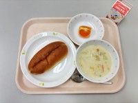 【4月28日の給食】*ピザドッグ*コーンシチュー*果物(カラマンダリン)*牛乳