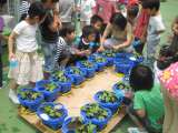 1年生が育てているアサガオの葉が、本葉になりました。子どもたちは、葉っぱが大きく...