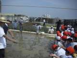 今日は5年生が屋上田んぼで田植えを行いました。例年同様、学校運営委員会、郷土研究...