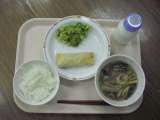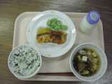 今日の給食はワカメご飯、さけのピザ風、塩ゆでそら豆、あおさのすまし汁、牛乳です。...