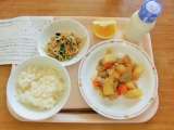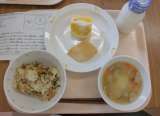 今日は、磯おこわ、牛乳、いかの照り焼き、豚汁、甘夏です。 メモは、食器の破損状況...