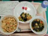 今日は、四色そぼろ丼、牛乳、和風サラダ、おふ汁、さくらんぼです。 メモは、さくら...