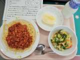 今日は、ヘルシーミートソース、牛乳、アスパラガスのサラダ、りんごです。 メモは、...