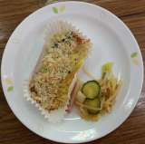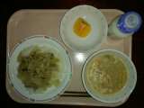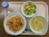 今日の給食は、「チキンライス」「たまごスープ」「ポテト入りフレンチサラダ」「牛...