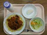 今日の給食は1年生のリクエスト給食です。メニューは「ナスのミートスパゲティ」「...