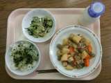 今日の給食は、「ごはん」「ふりかけ」「肉じゃがうま煮」「大根サラダ」「牛乳」で...