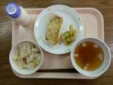 今日の給食は、「豆ごはん」「鮭のガーリック焼き」「あられ麩のすまし汁」「牛乳」...