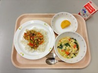 【9月17日の給食】*チンジャオロース丼*たまごとチンゲンサイのスープ*果物(柿...